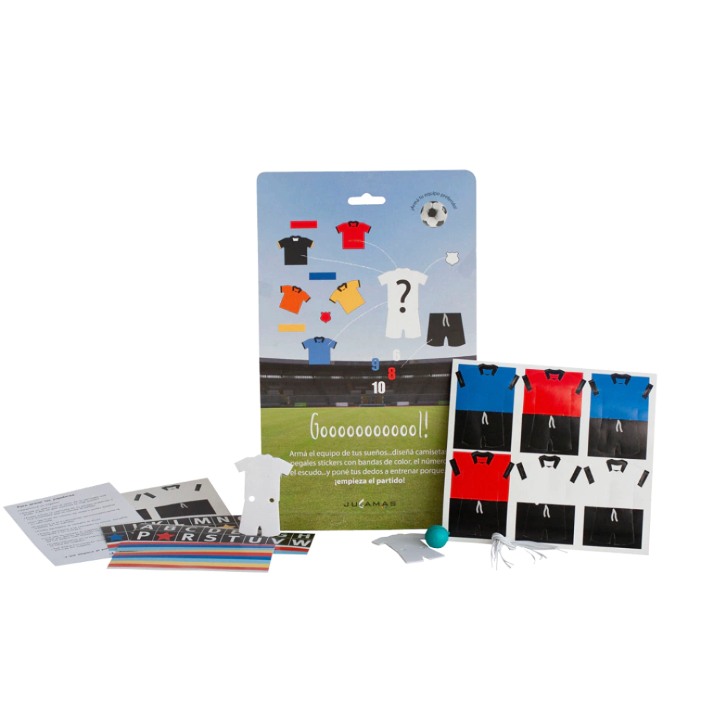 Contiene: camisetas, stickers para decorarlas, pelotita, kit para armar 2 arcos, elástico.